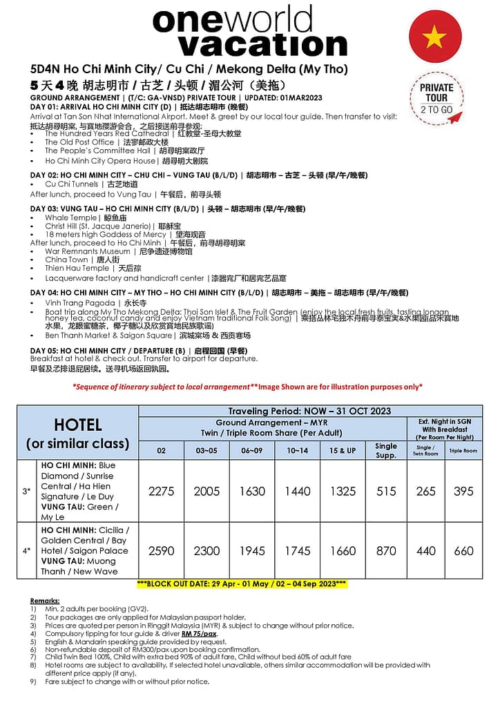 Ho Chi Minh City/ Cu Chi / Mekong Delta (My Tho) 5D4N